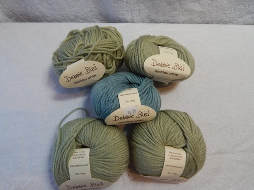 DEBBIE BLISS MERINO  ARAN 5 SKEINS 4 GREEN 1 BLUE 100% MERINO WOOL